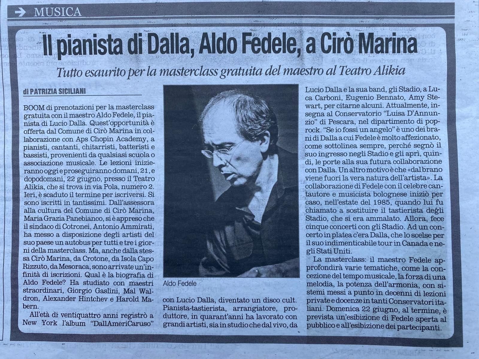 Nel quadro delle attività culturali promosse dalla Chopin Academy APS, si è svolta a Cirò Marina una masterclass pianistica gratuita con il Maestro Aldo Fedele, storico pianista di Lucio Dalla, evento di grande rilievo artistico e umano per il territorio.