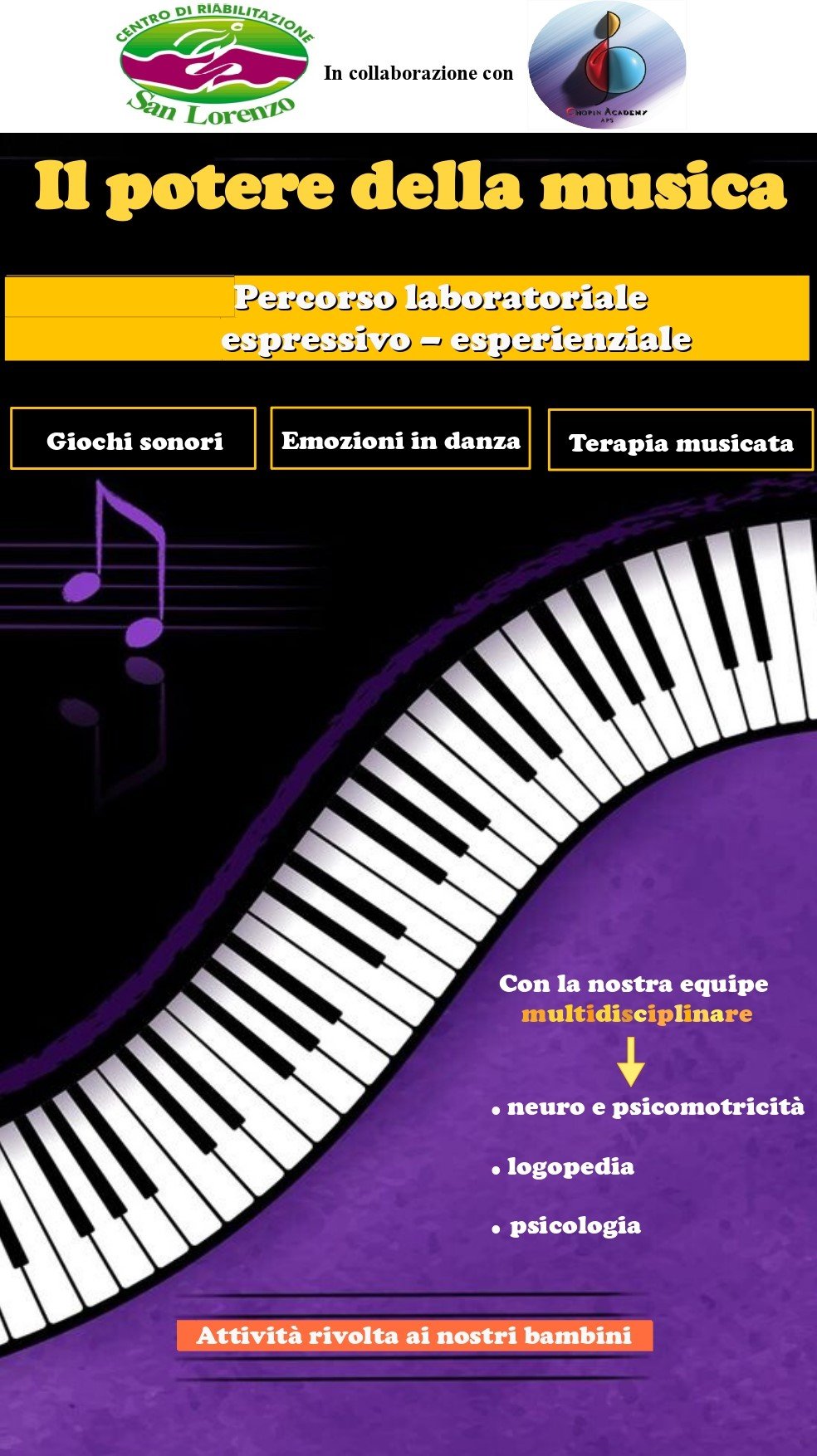 L’iniziativa ha visto il coinvolgimento diretto del Maestro Antonio Miletta, Presidente della Chopin Academy APS, in collaborazione con l’équipe multidisciplinare del Centro, composta da professionisti dell’area della neuro e psicomotricità, della logopedia e della psicologia.